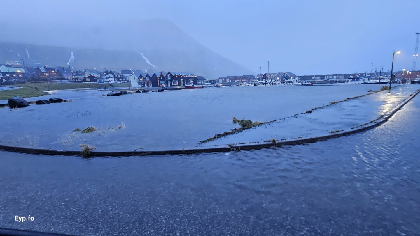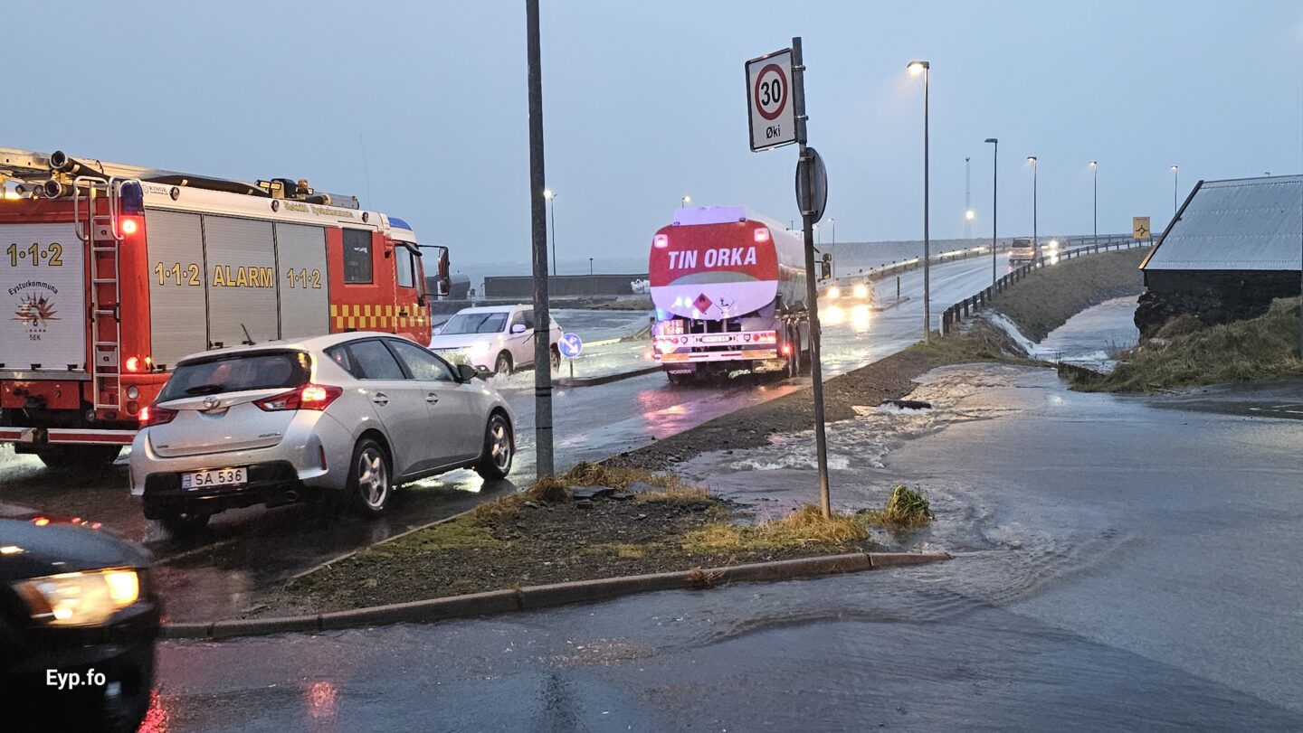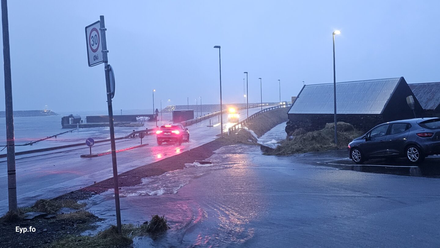 Í Leirvík er í løtuni sera nógv vatn á vegnum í bygdini og tarnar tað eisini ferðsluni.