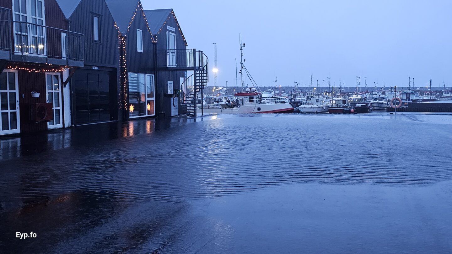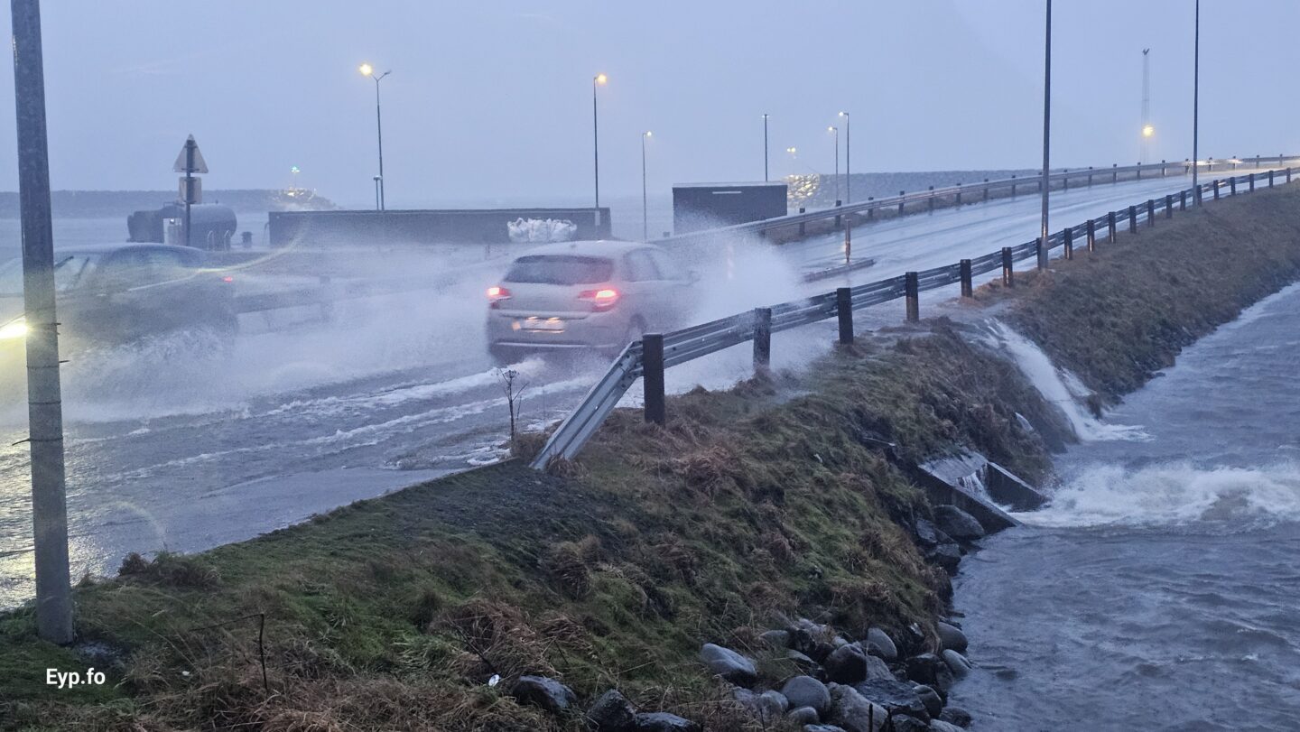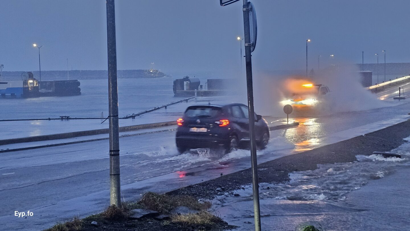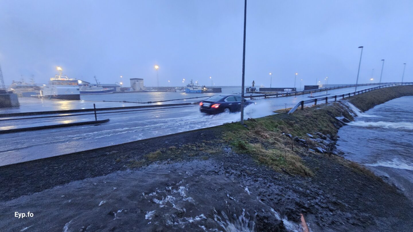 Í Leirvík er í løtuni sera nógv vatn á vegnum í bygdini og tarnar tað eisini ferðsluni.