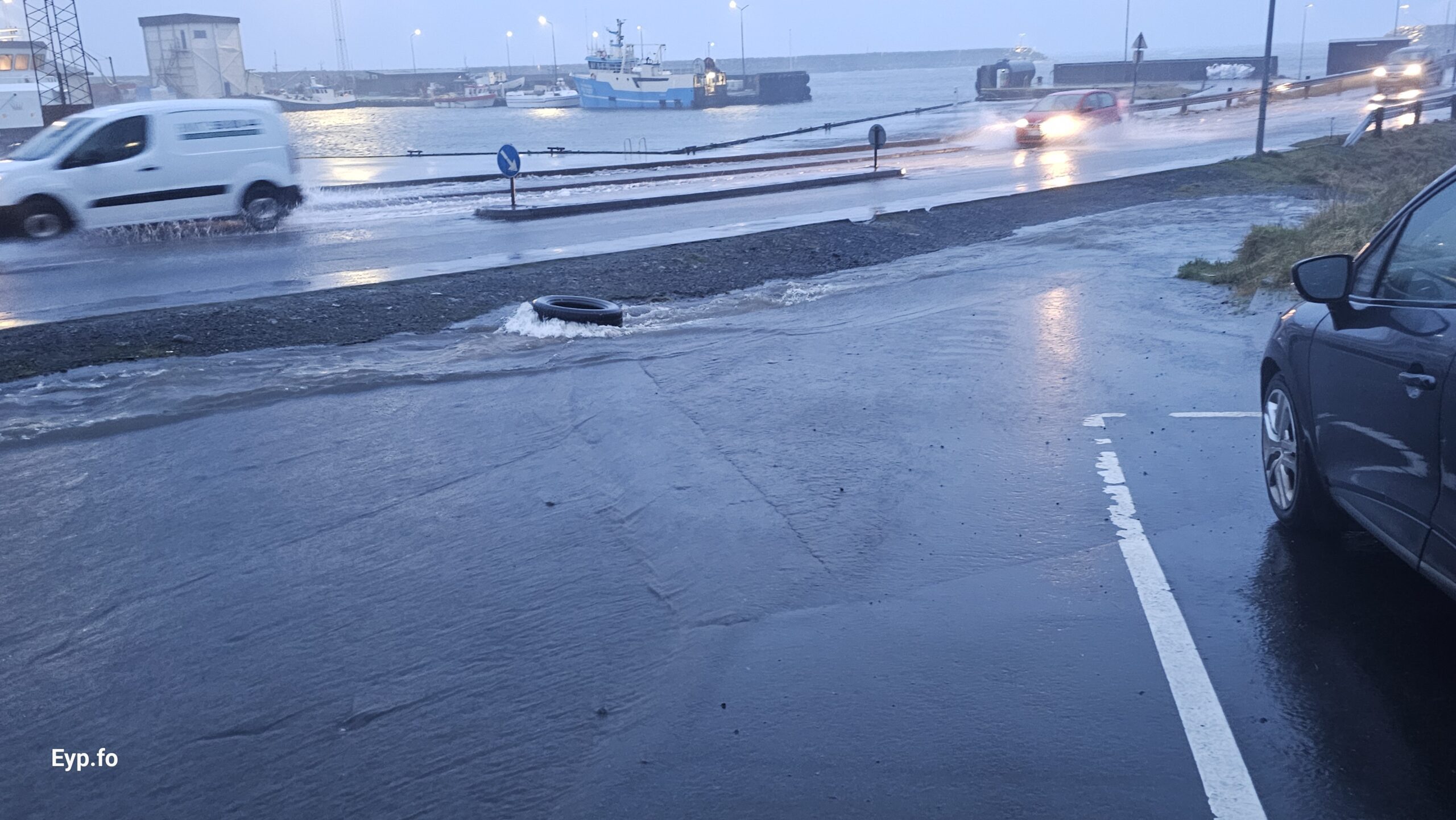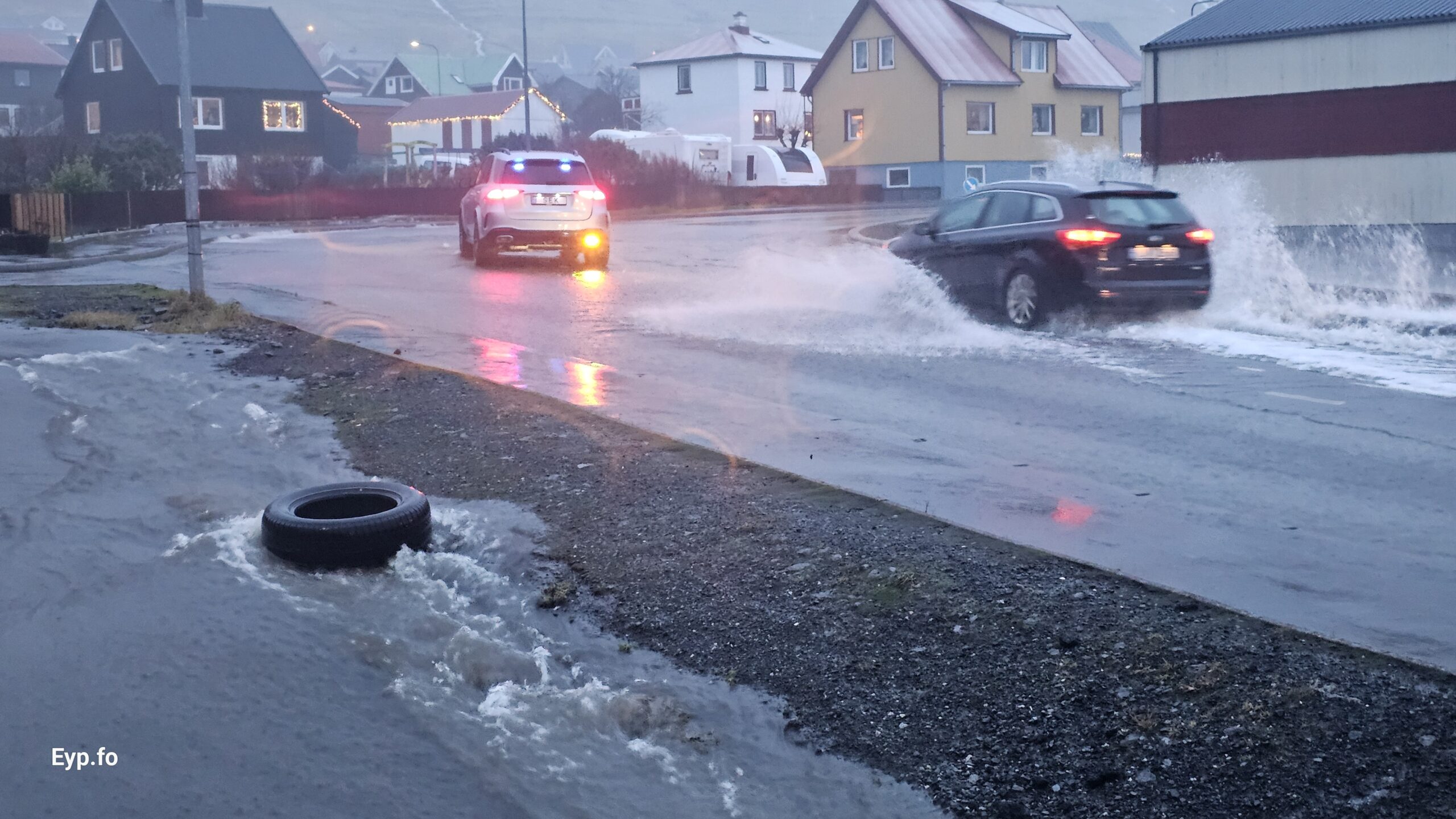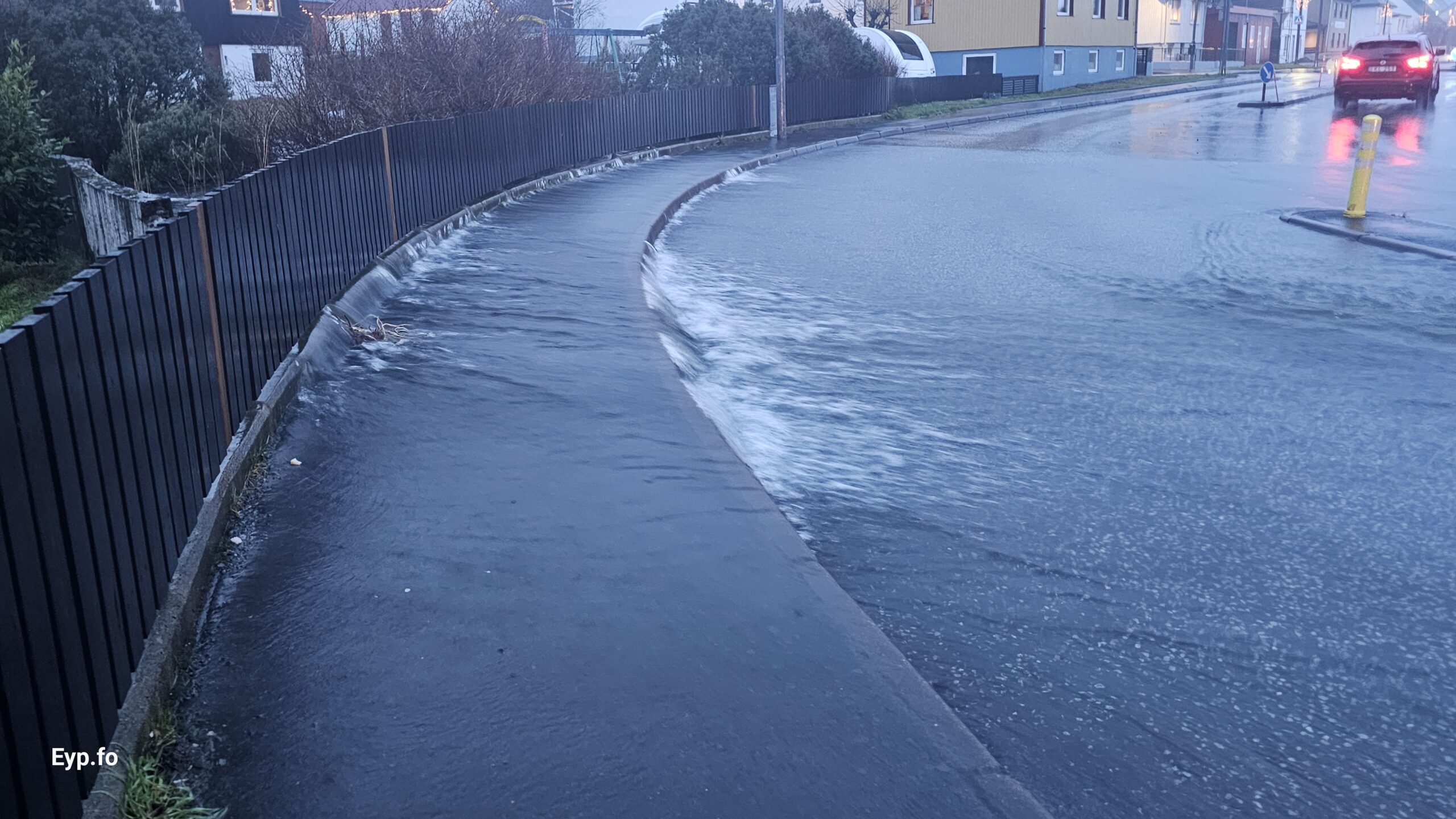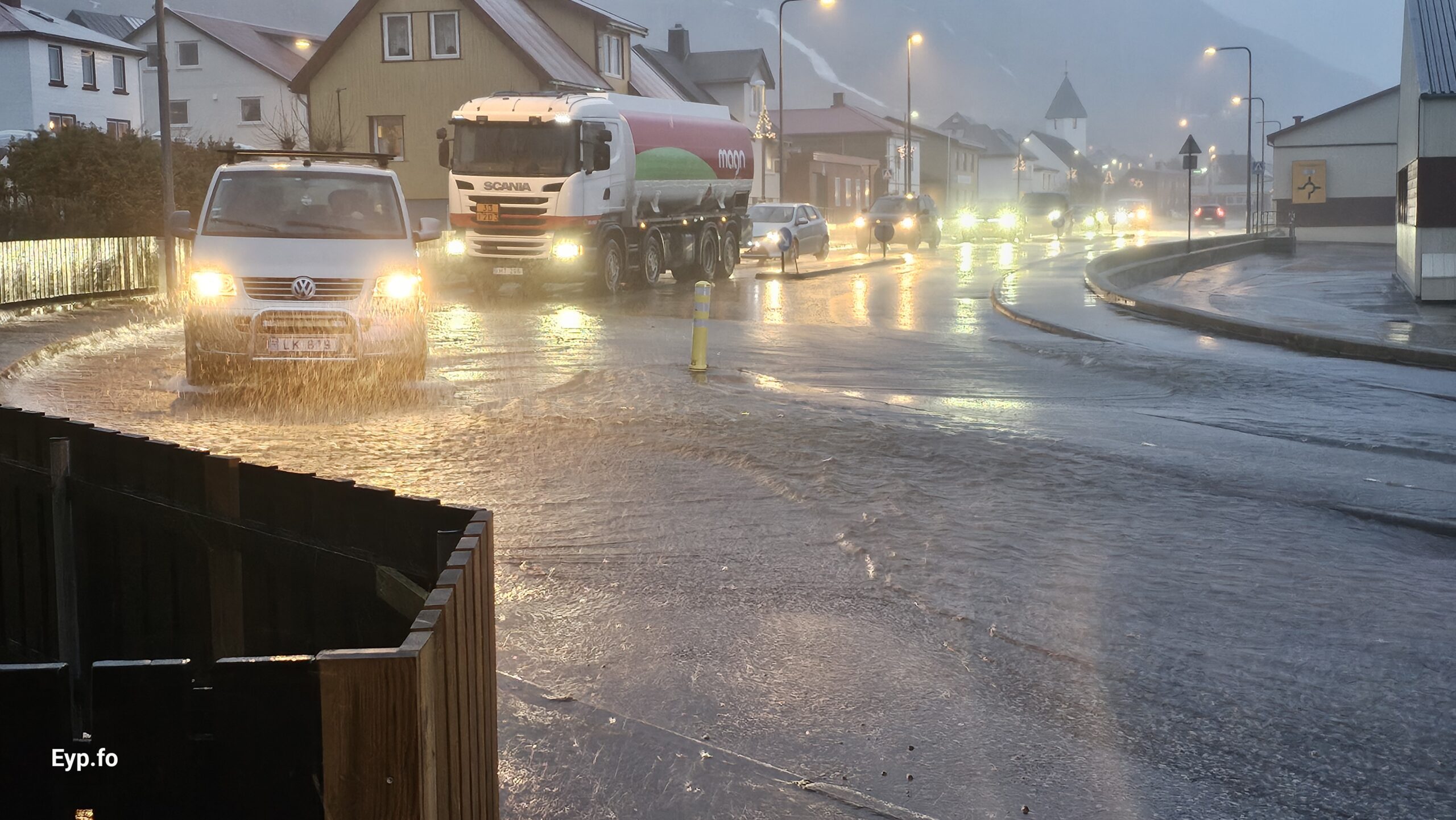 Í Leirvík er í løtuni sera nógv vatn á vegnum í bygdini og tarnar tað eisini ferðsluni.