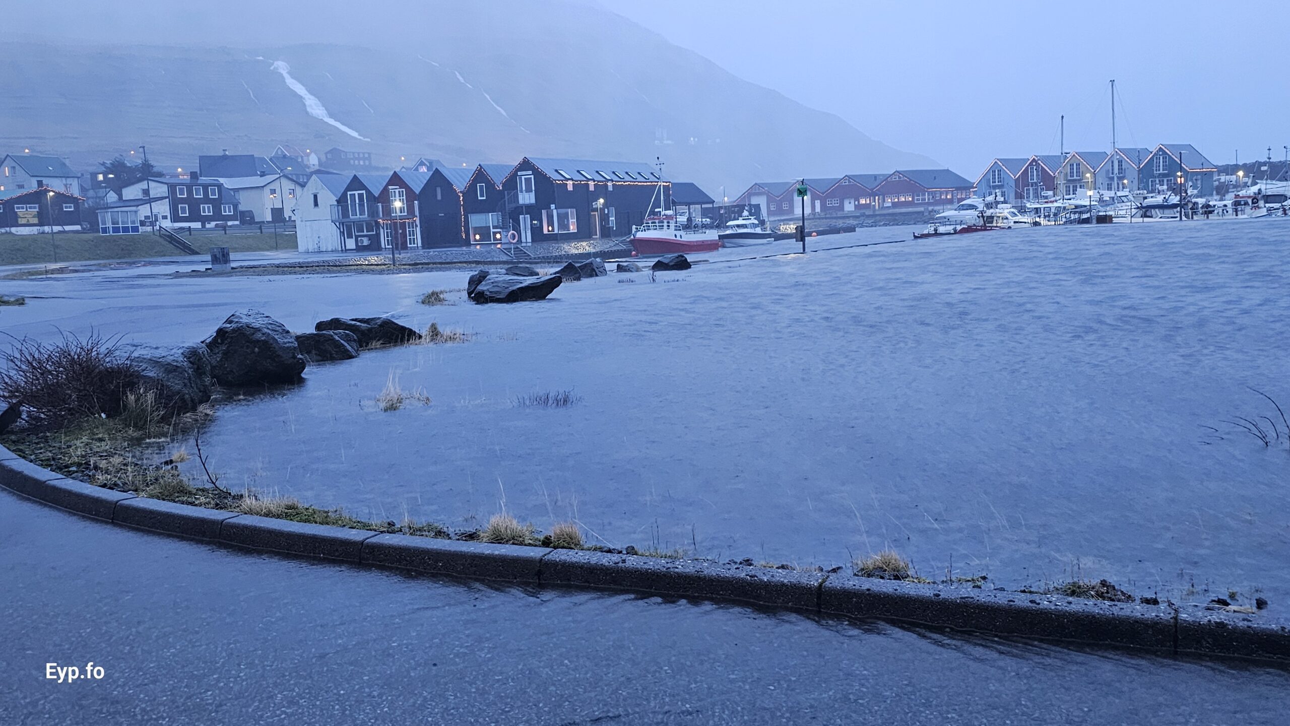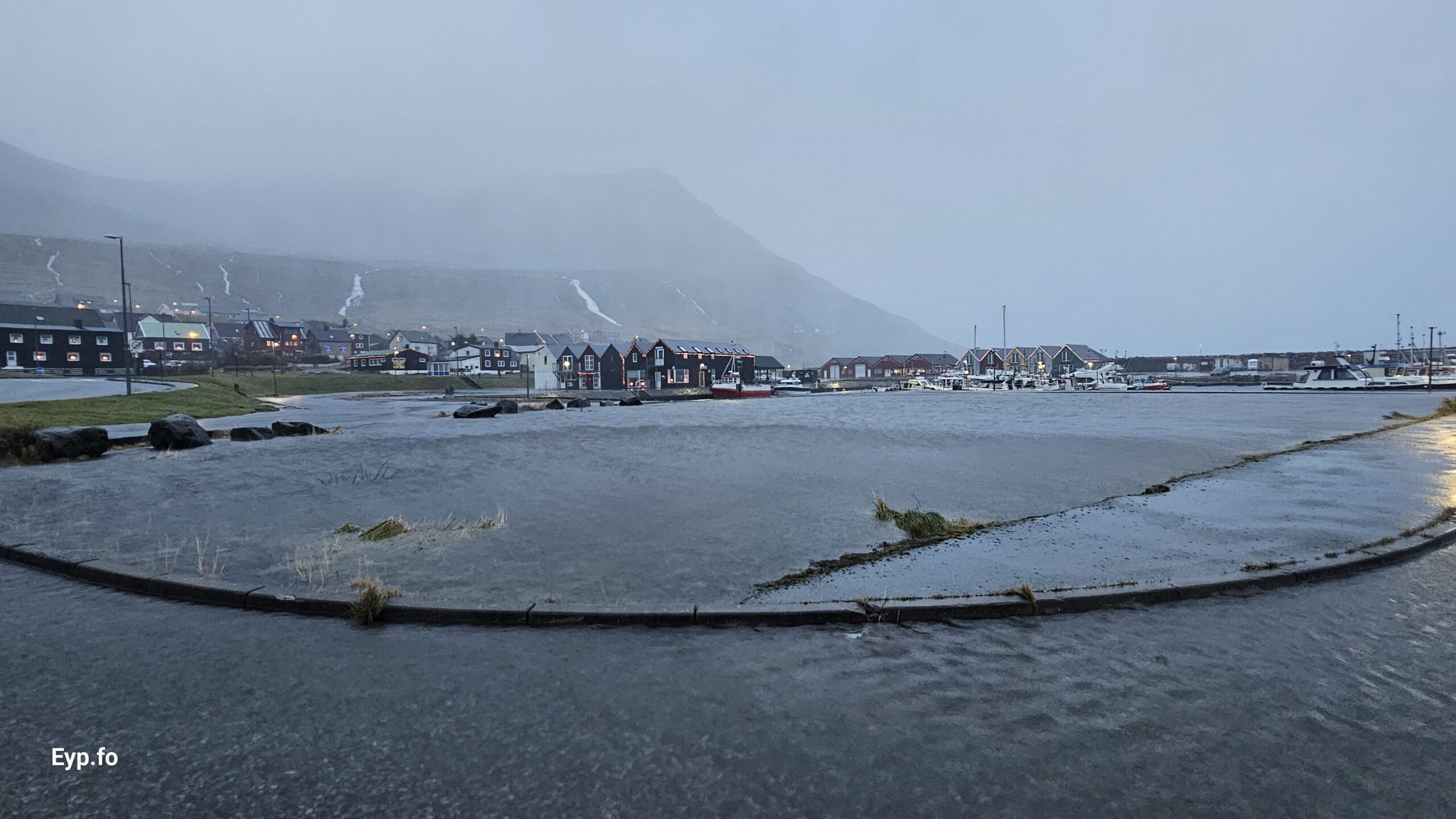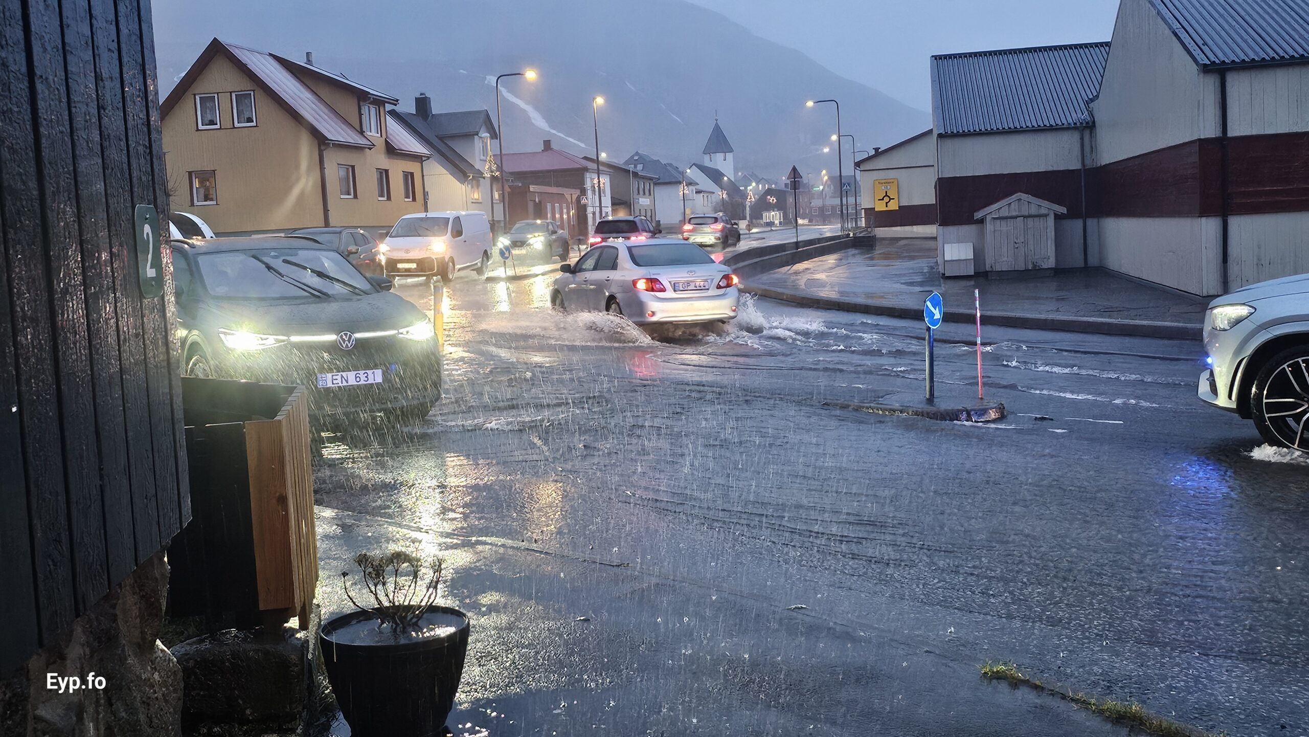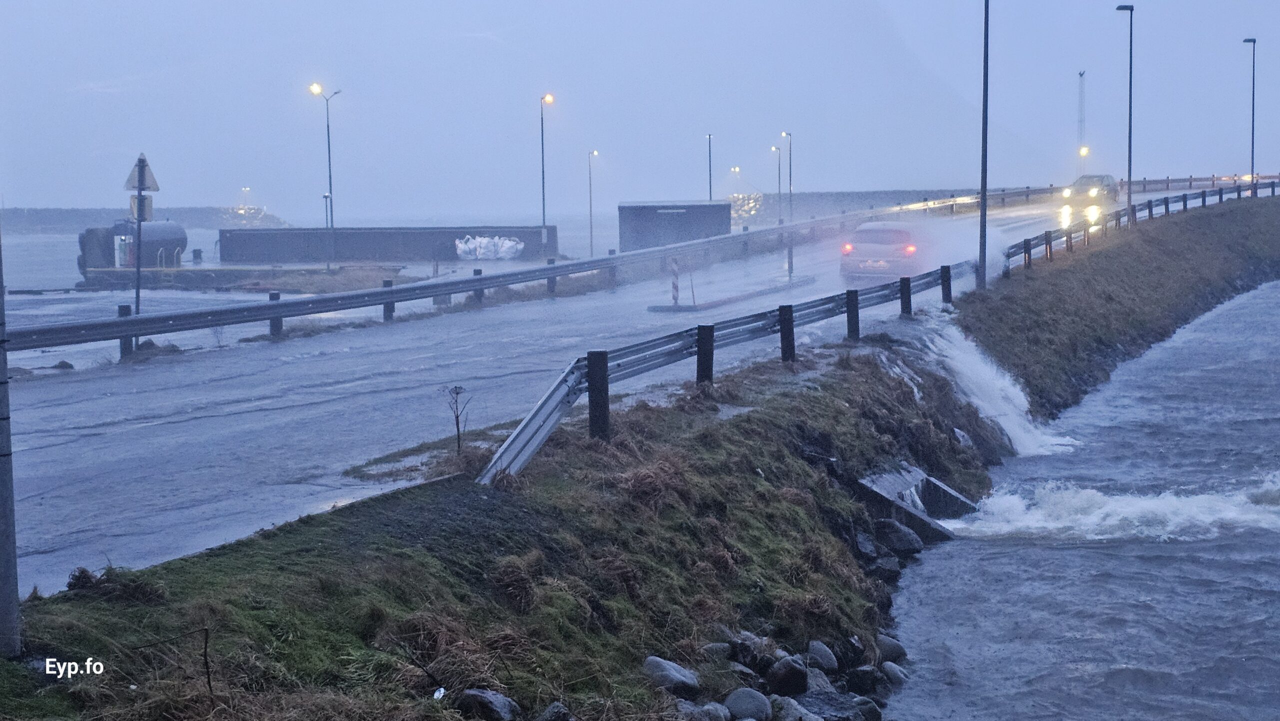Í Leirvík er í løtuni sera nógv vatn á vegnum í bygdini og tarnar tað eisini ferðsluni.