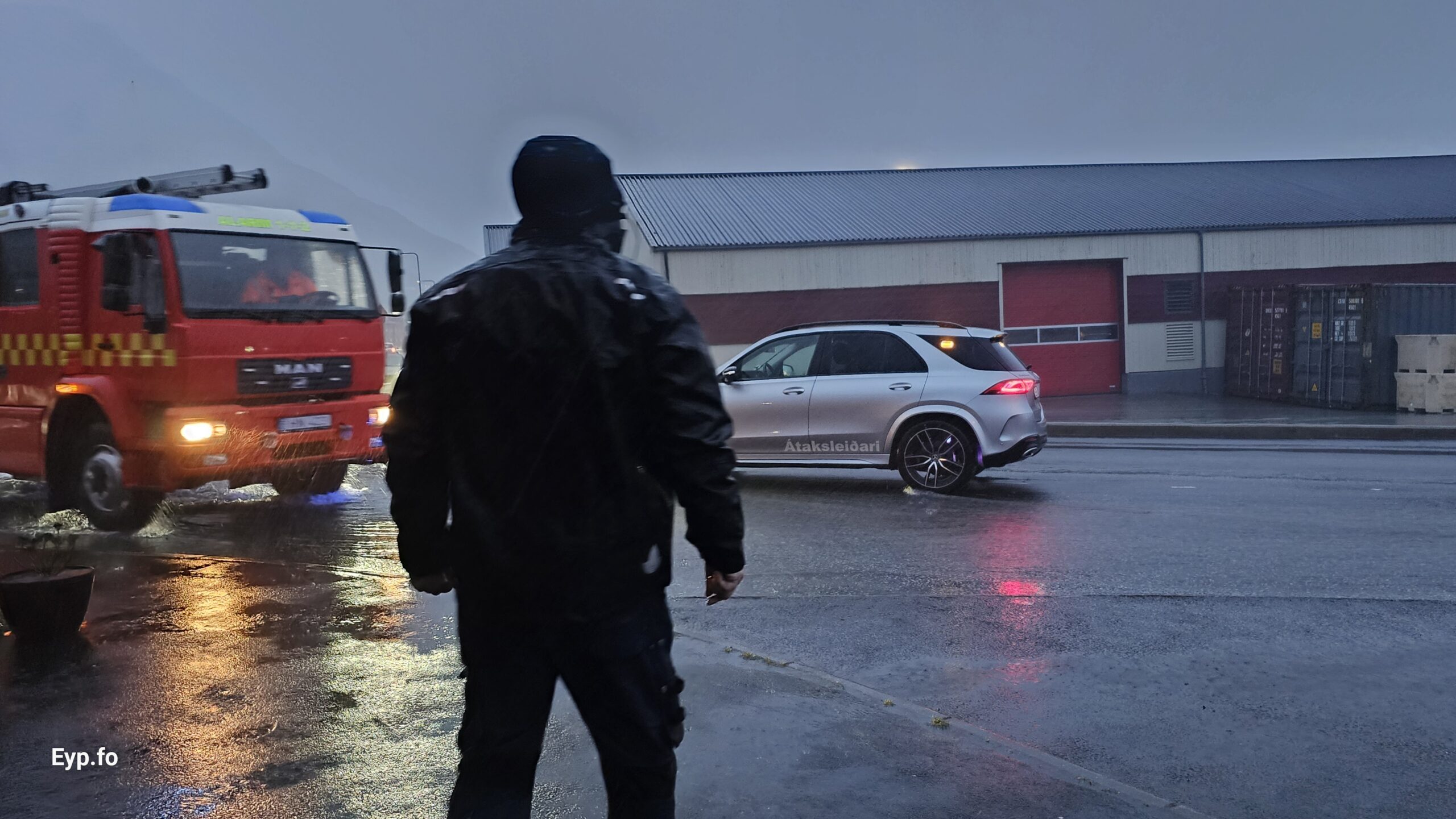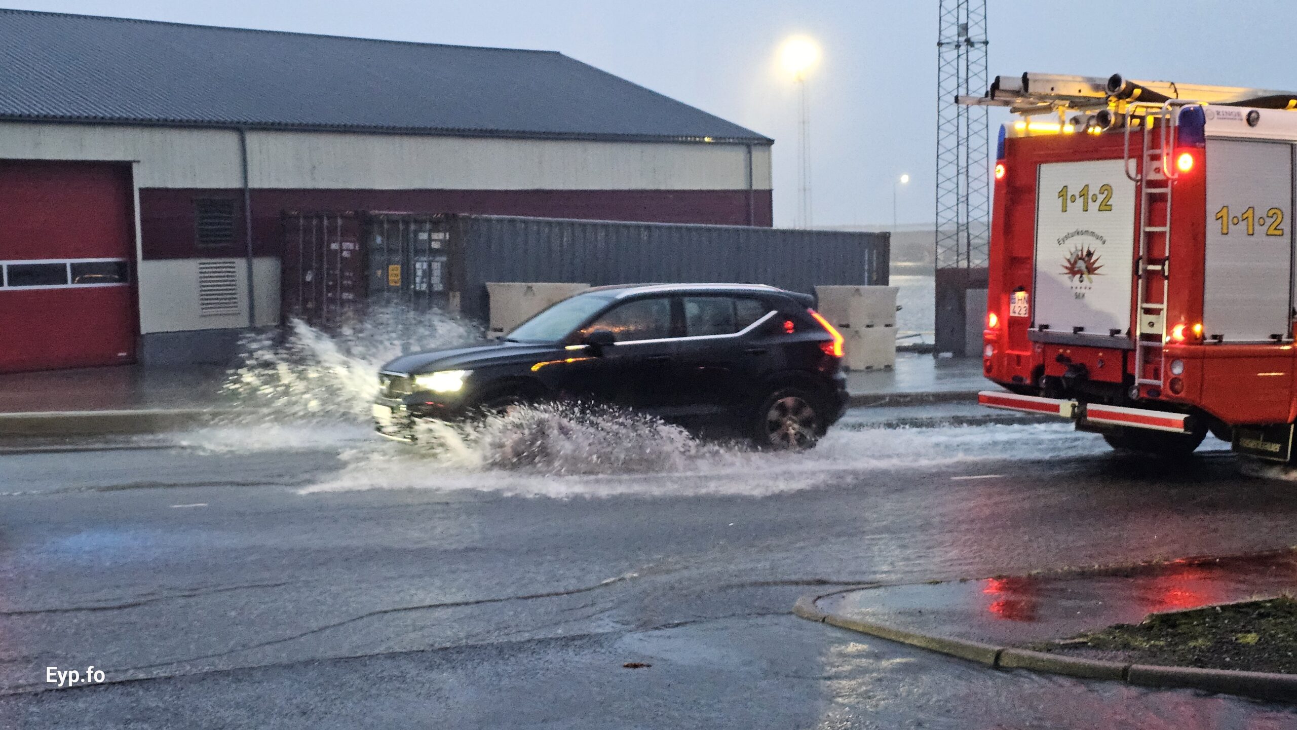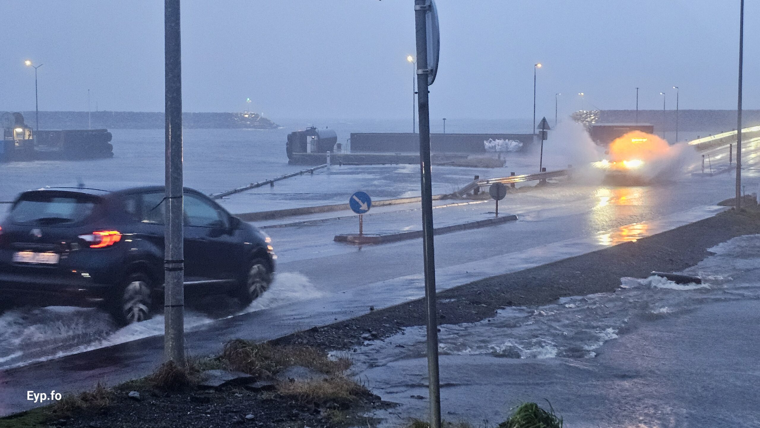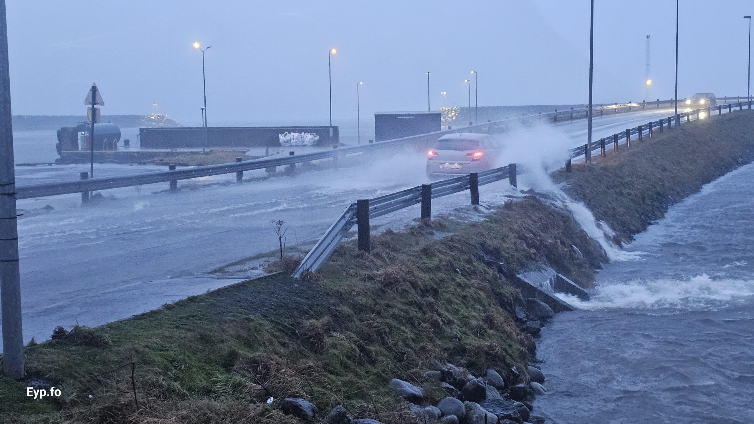 Í Leirvík er í løtuni sera nógv vatn á vegnum í bygdini og tarnar tað eisini ferðsluni.